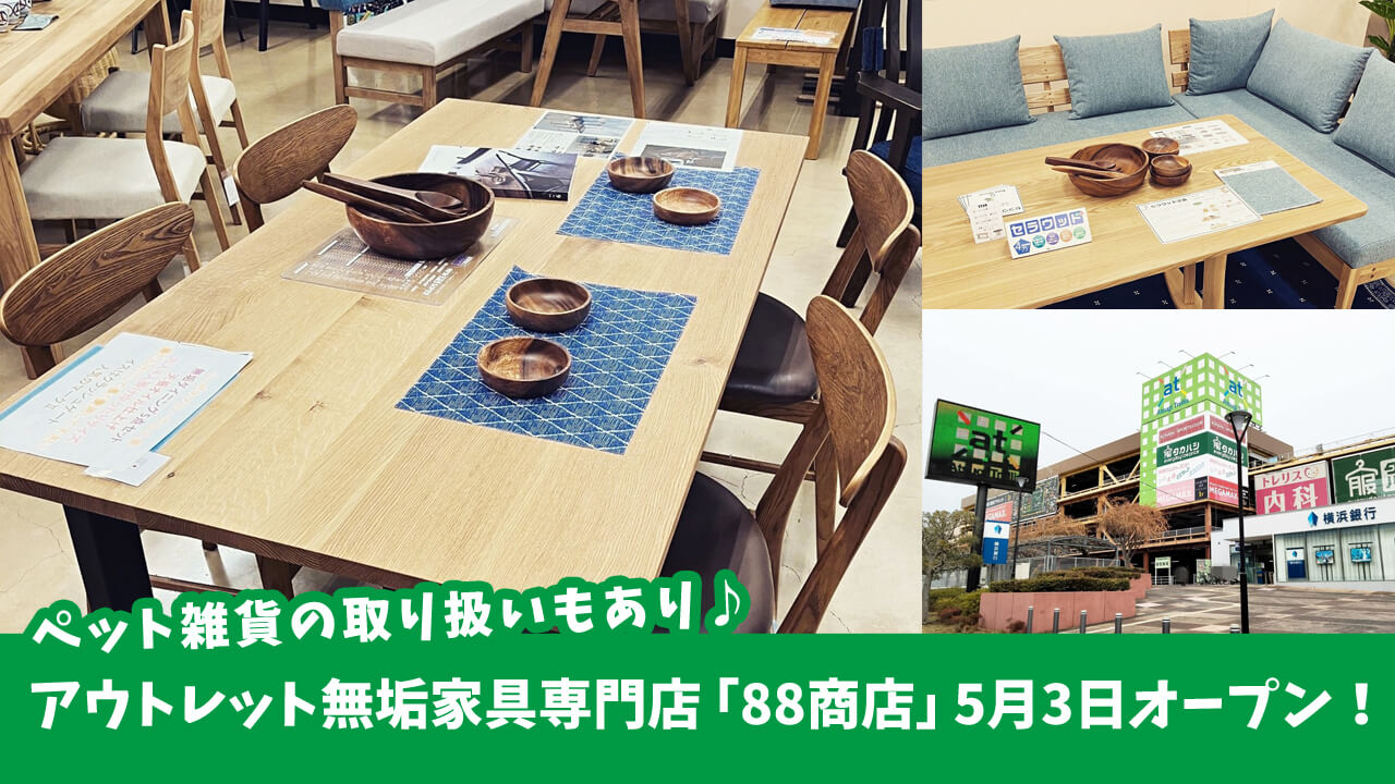 開店 アツギトレリス3Fに、アウトレット無垢家具専門店「88商店」が5月3日オープン!ペット雑貨の取り扱いもあり♪ 厚木市戸室本厚木・厚木情報メディア厚木らぼ。