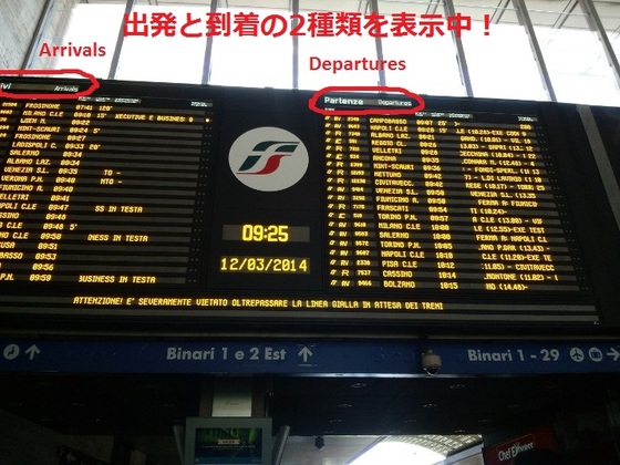 イタリアの鉄道駅構内の列車の電光掲示板の見方。地球の歩き方。