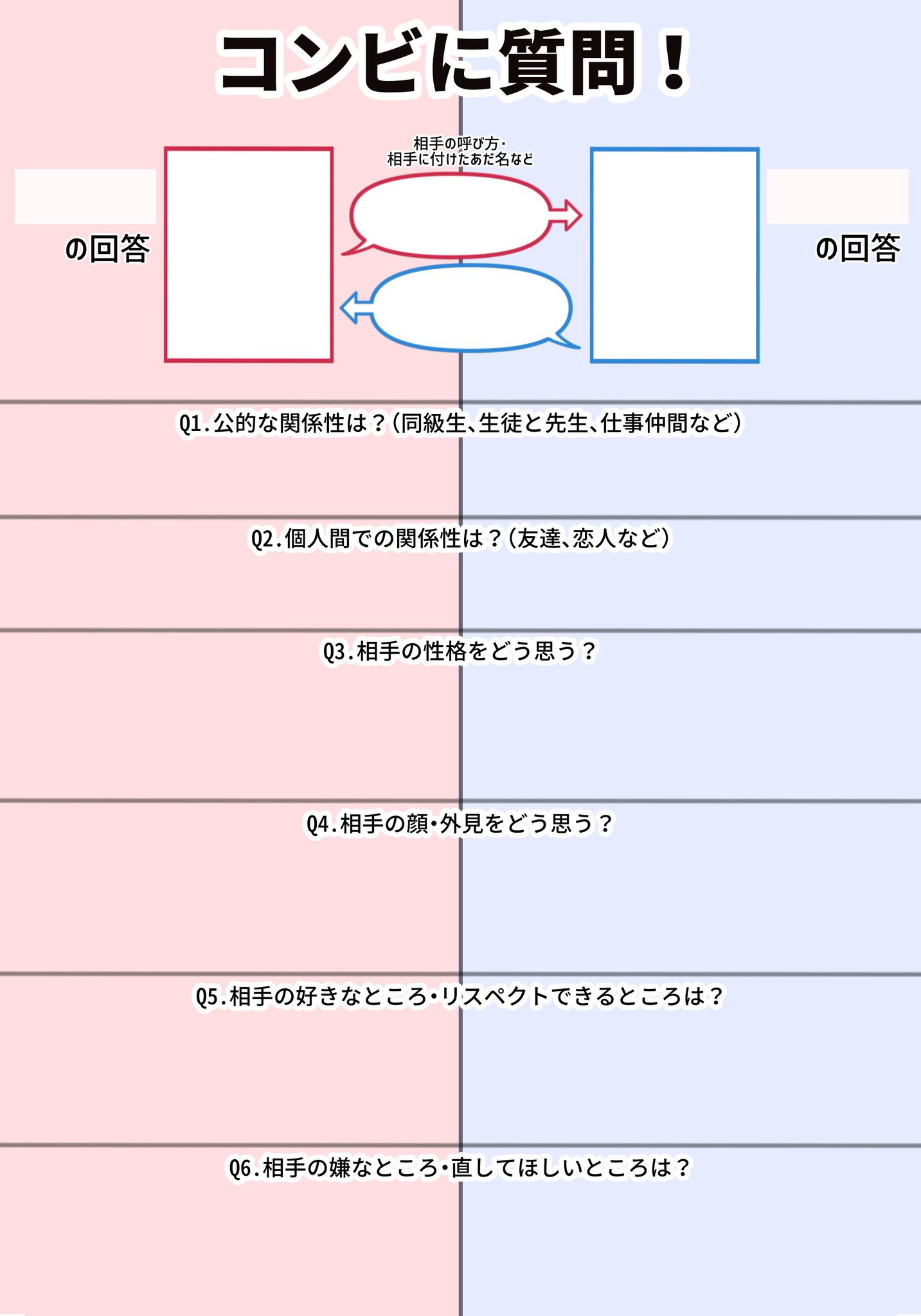 なろ on X: " コンビに質問 二人組用質問シートです!以前使っていた垢で上げたものをそのまま再掲させていただきます!またどうぞご自由に !https:t.co ymqr3Tdrke"X。