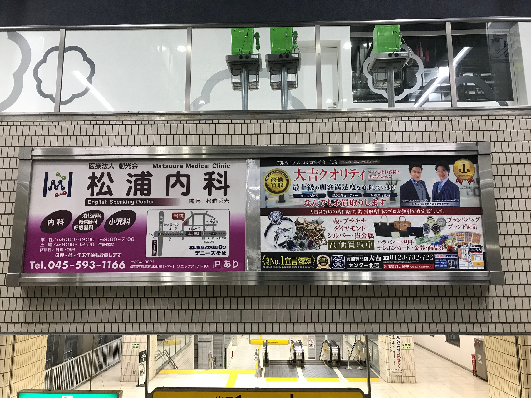 センター北駅 駅看板 広告 階段目の前のおでこ看板~買取専門店様の事例~サンエイBLOG交通広告の株式会社サンエイ企画。