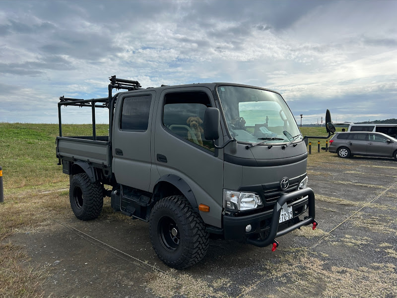 遂に完成! トヨエースAWD 4.5inアップ キャンピング車施工 他車用グリルガード オープンカントリーmt オーバーランダーダイナダブルキャブダイナリフトアップダイナダブルキャブ4wdダイナキャンピングカ。