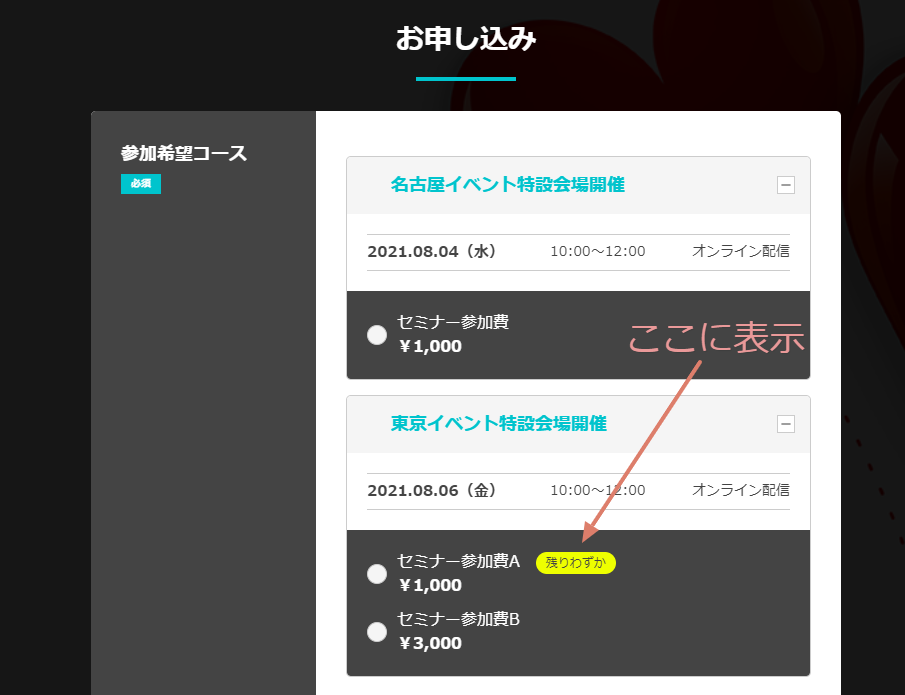 申込みが定員に近づいたらフォームに「残りわずか」を表示したい – セミカンヘルプ。