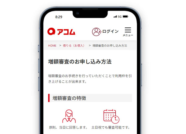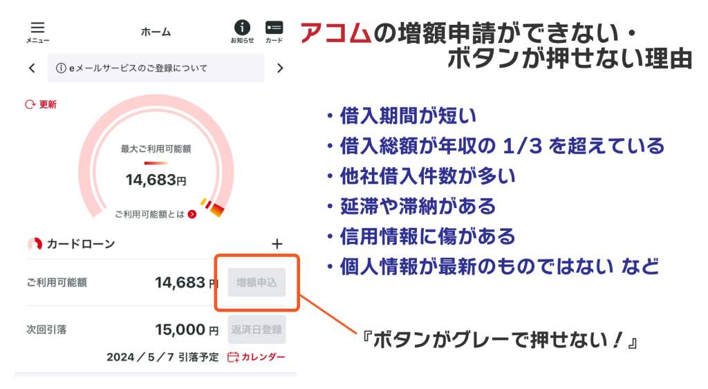 アコムの増額申込ボタンが表示されない・押せない理由は?申請できないときの対処法を紹介ローンステップ手帳。
