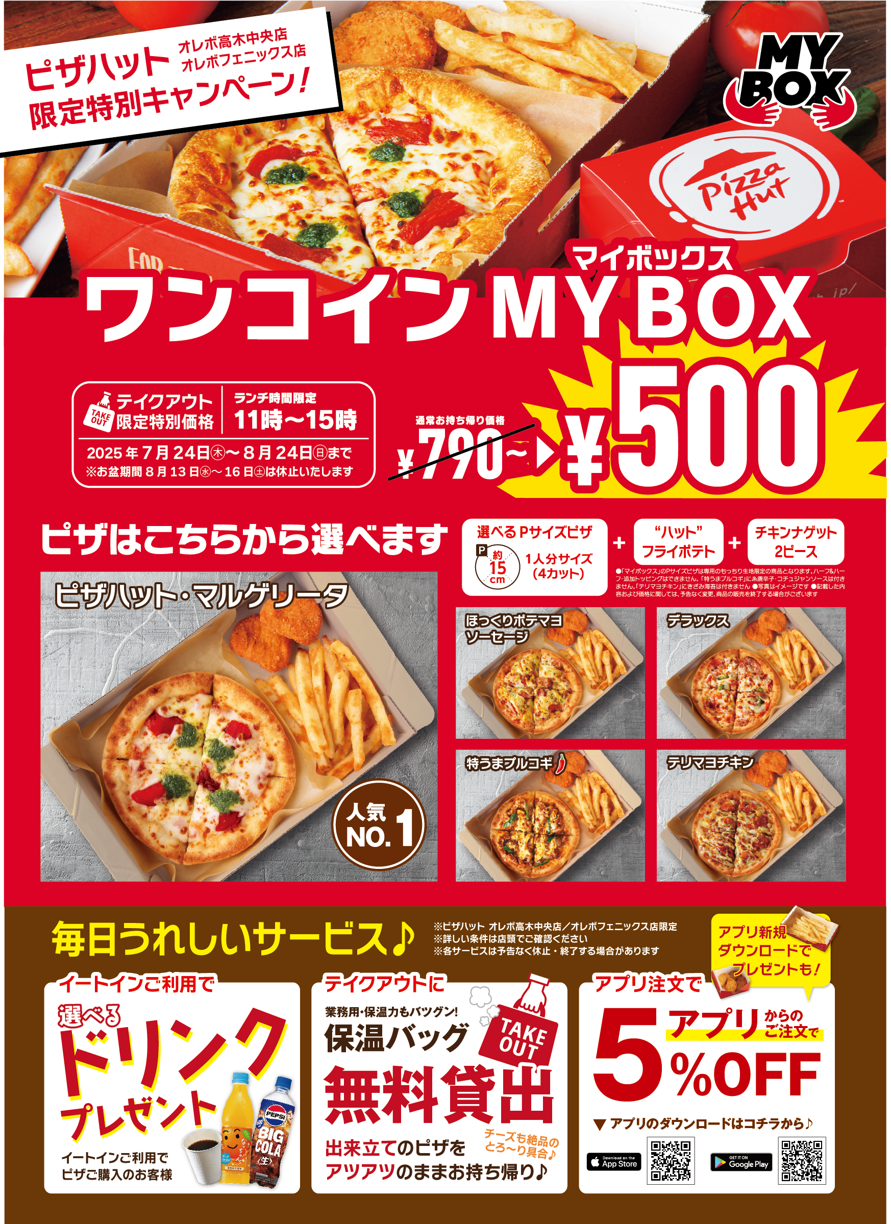 チラシ紹介ピザハット徳島店 様 >>🍕 ピザ全品 🍕>> お持帰り 50%OFF デリバリー 30%OFF >>>>>>>>>>>>>>>>🙆大好評❗️500万個突破‼️おひとりさまピザセットマイボックスmybox ☑ 選べるSサイズピザ ☑ "ハット"フライドポテト ☑チキンナゲット2コ 👉ピザ以外。