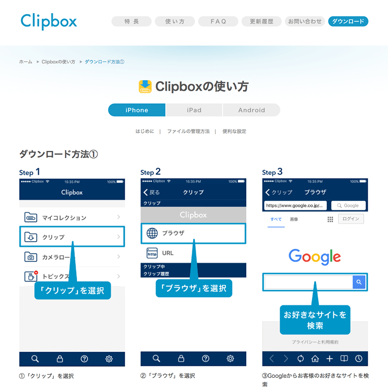 使い方 ダウンロード方法①Clipboxオフィシャルサイト。