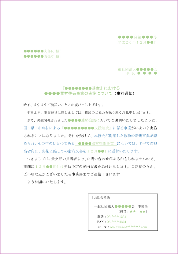 通知状通知文、関係者への事前説明・周知、事業開始、新制度発足等ビジネス文書クリップ。