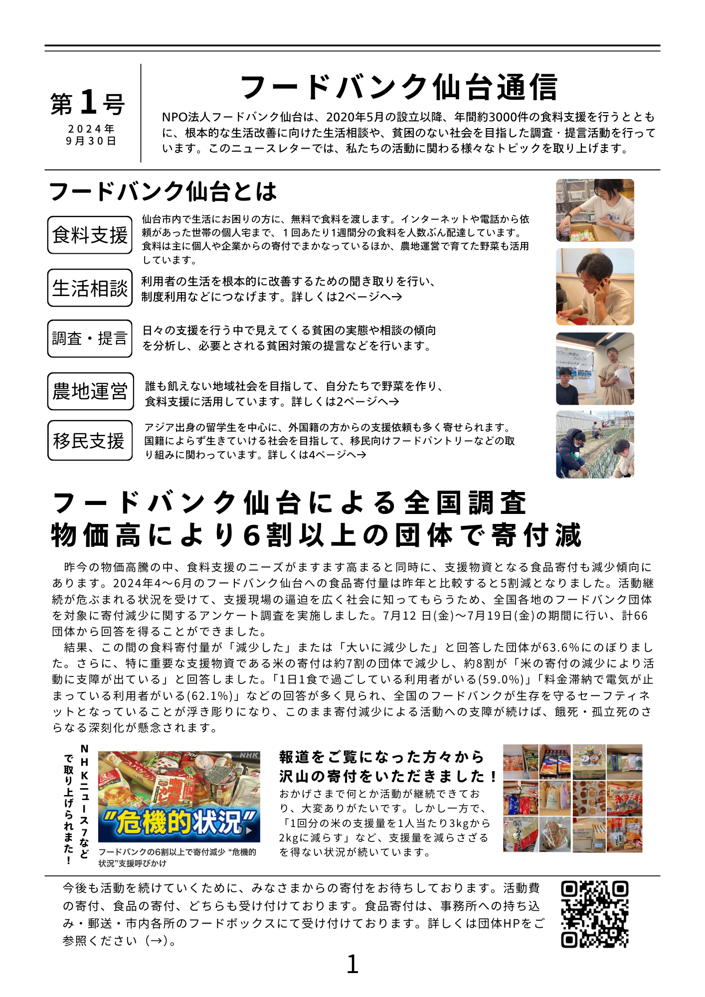 フードバンク仙台通信、創刊号発刊! 2024年10月フードバンク仙台。