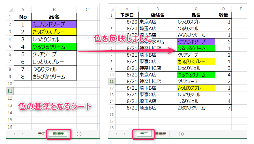 2つの表 重複に色を付けるセル範囲 クリエアナブキのちょこテク。