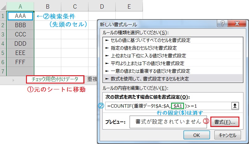 VBA 別シートと同じ値に色付け:重複チェック 動画ありkirinote.com。