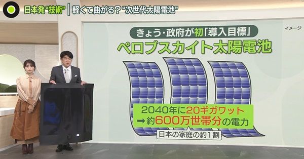 軽くて曲がる太陽電池? 次世代型「ペロブスカイト」の“夢と現実”政府が目標策定「2040年に600万世帯分」 実現の可能性は 2024年11月26日掲載 日テレNEWS NNN。