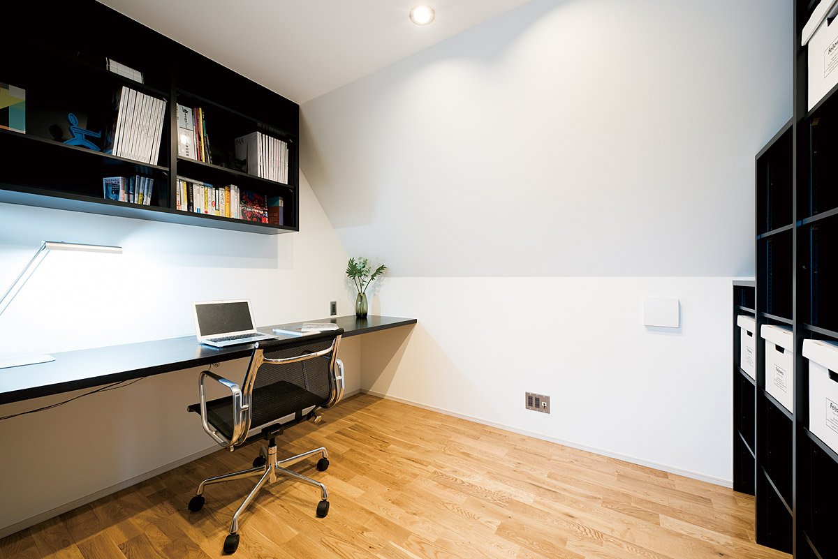 収納力抜群の棚とデスクを備えた、機能的でスタイリッシュな書斎 仕事部屋 スタディコーナー -事例写真「モダン3階建ての家」注文住宅のハウスネットギャラリ。