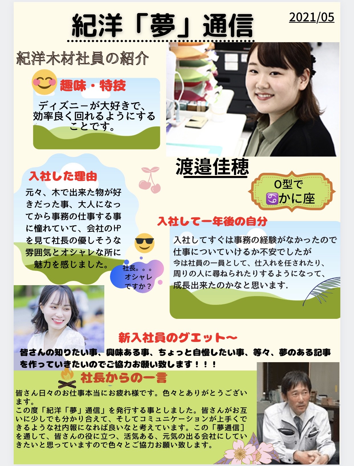 社内報!5月号!型枠工事の木材なら紀洋木材株式会社。