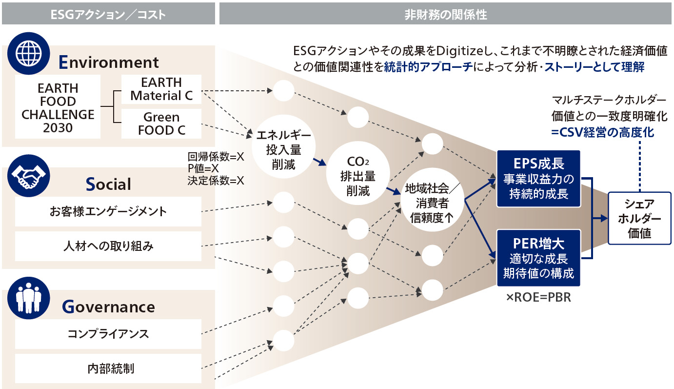 ESG課題を「財務指標との関係性」と「ESG指標同士の関係性」の両面で分析。企業価値との関係を可視化し、CSV経営の高度化につなげる事例アビームコンサルティング。
