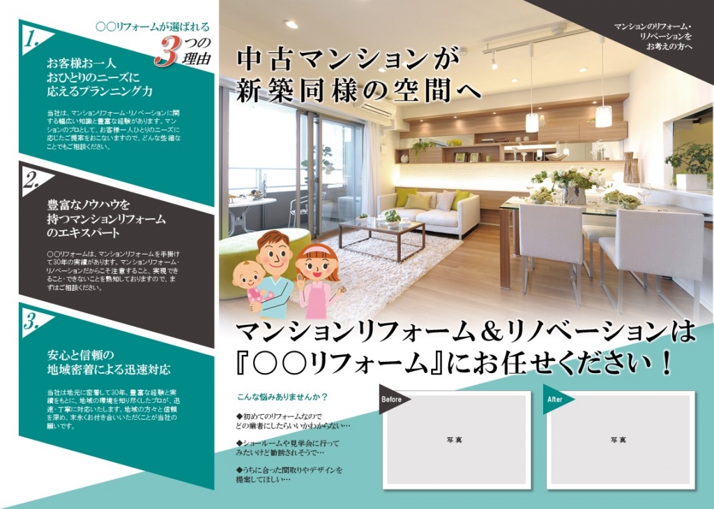 マンションリフォーム専門チラシデザインリフォーム・外壁塗装のチラシデザイン、ホームページ制作はチームカスガイ。
