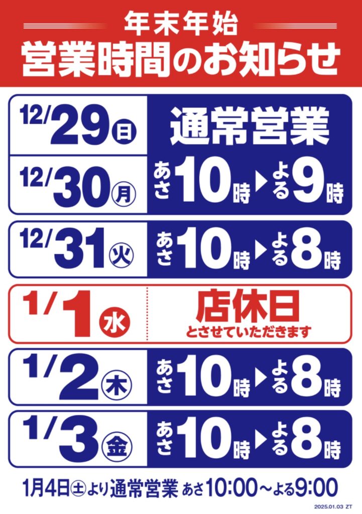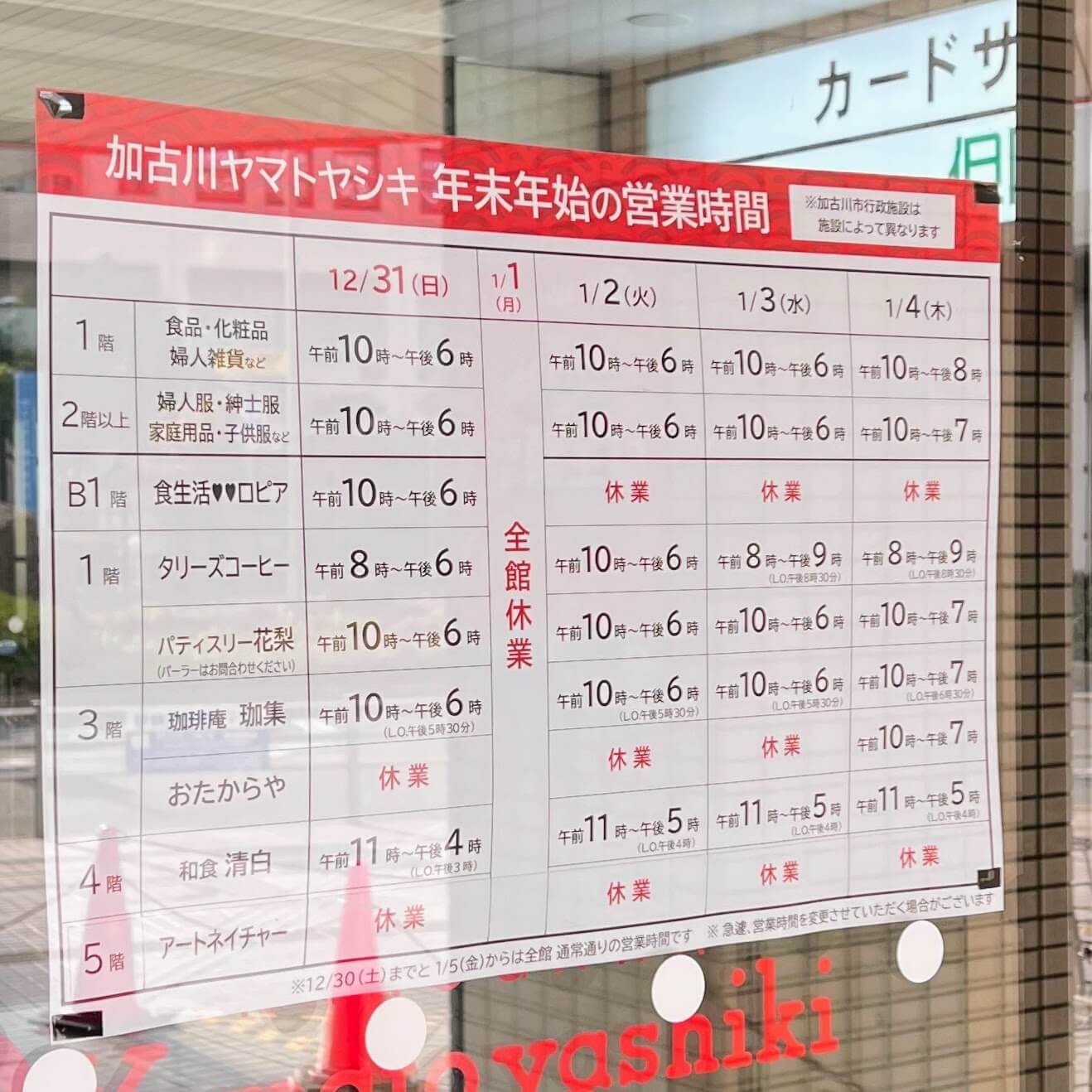 年末年始の営業時間のお知らせです。 12月31日 火 午前9時半から午後7時 1月1日 水 お休み 1月2日 木 午前9時半から午後6時1月3日 金 お休み 1月4日 土 お休み 1月5日 日 お休み 1月6日 月 から平常営業午前9時半から午後8時 となります。 年末年始年始は閉店。