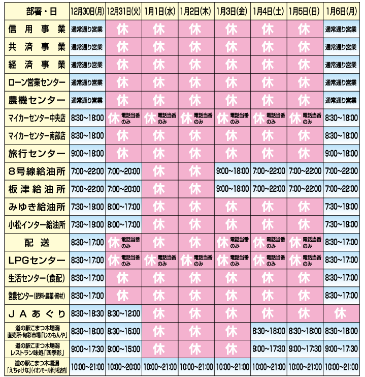 年末年始営業時間のお知らせ新着一覧JA小松市。