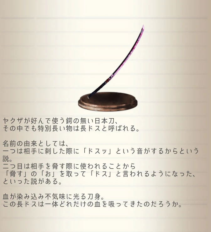 世界の武器防具百科!! on X: "ドス:日本。古くから博徒やヤクザ が喧嘩に使用した短刀。一般的に白鞘に納められ鍔は無い。金に困った一部の包丁鍛冶などが作ったと言われ、刀剣と言うには粗悪過ぎる出来のものがほとんど。長さは30~40cm程度だが、1尺8寸以上のものは。