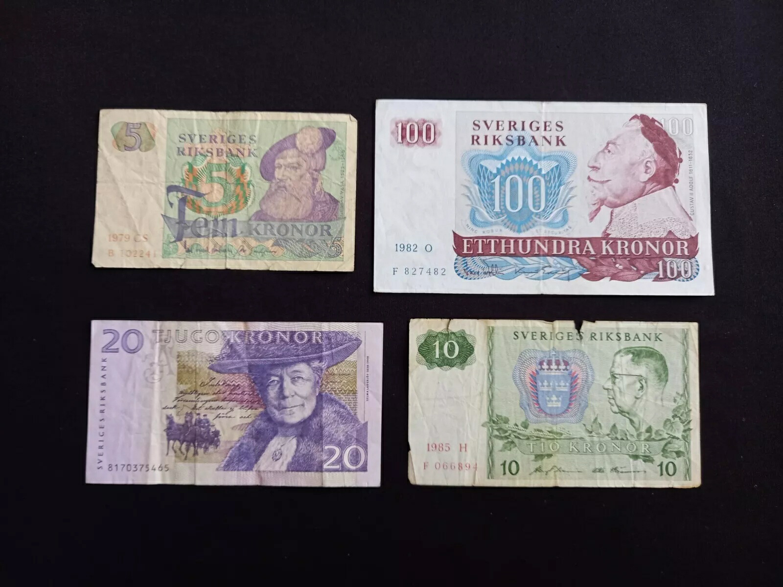 スウェーデンスウェーデン 51979+ 10 + 20 + 1001982クローナ紙幣 - 流通。