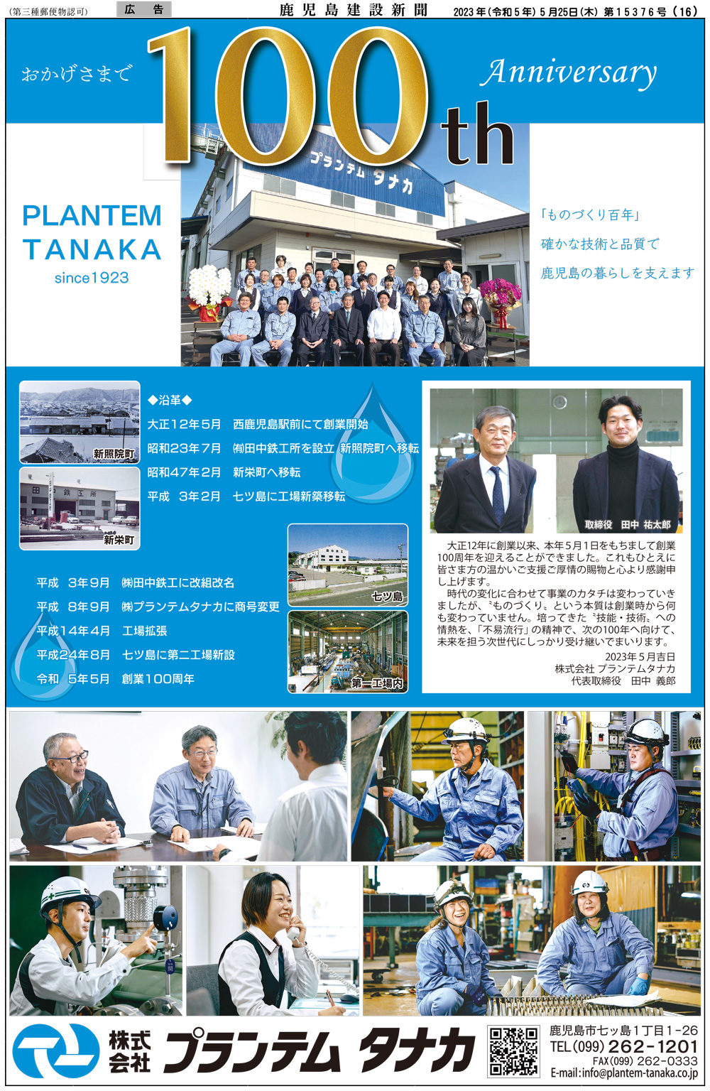 建設新聞に100周年広告掲載 - 株式会社プランテムタナカ鹿児島の水インフラを支えるプラントシステム会社。