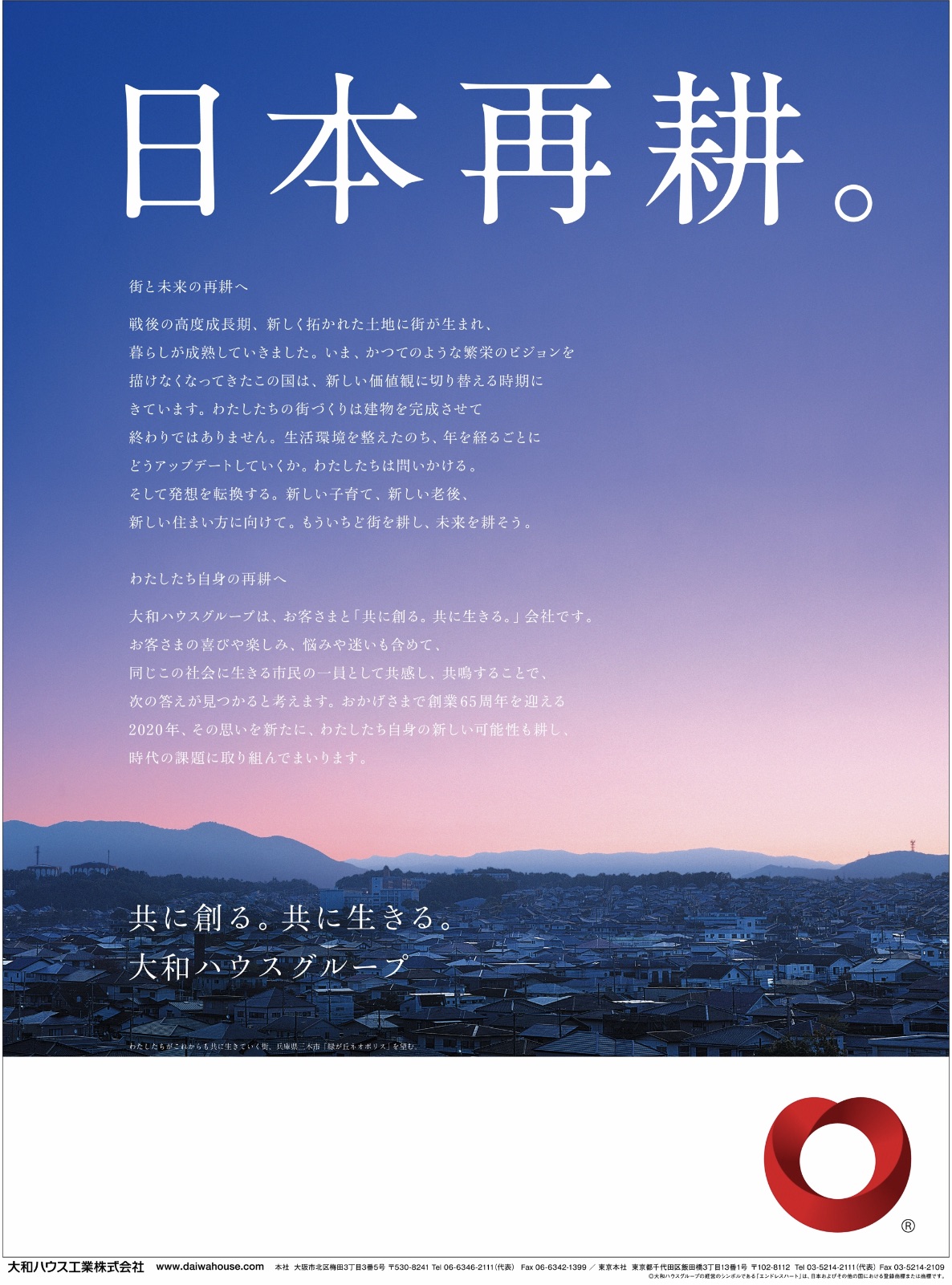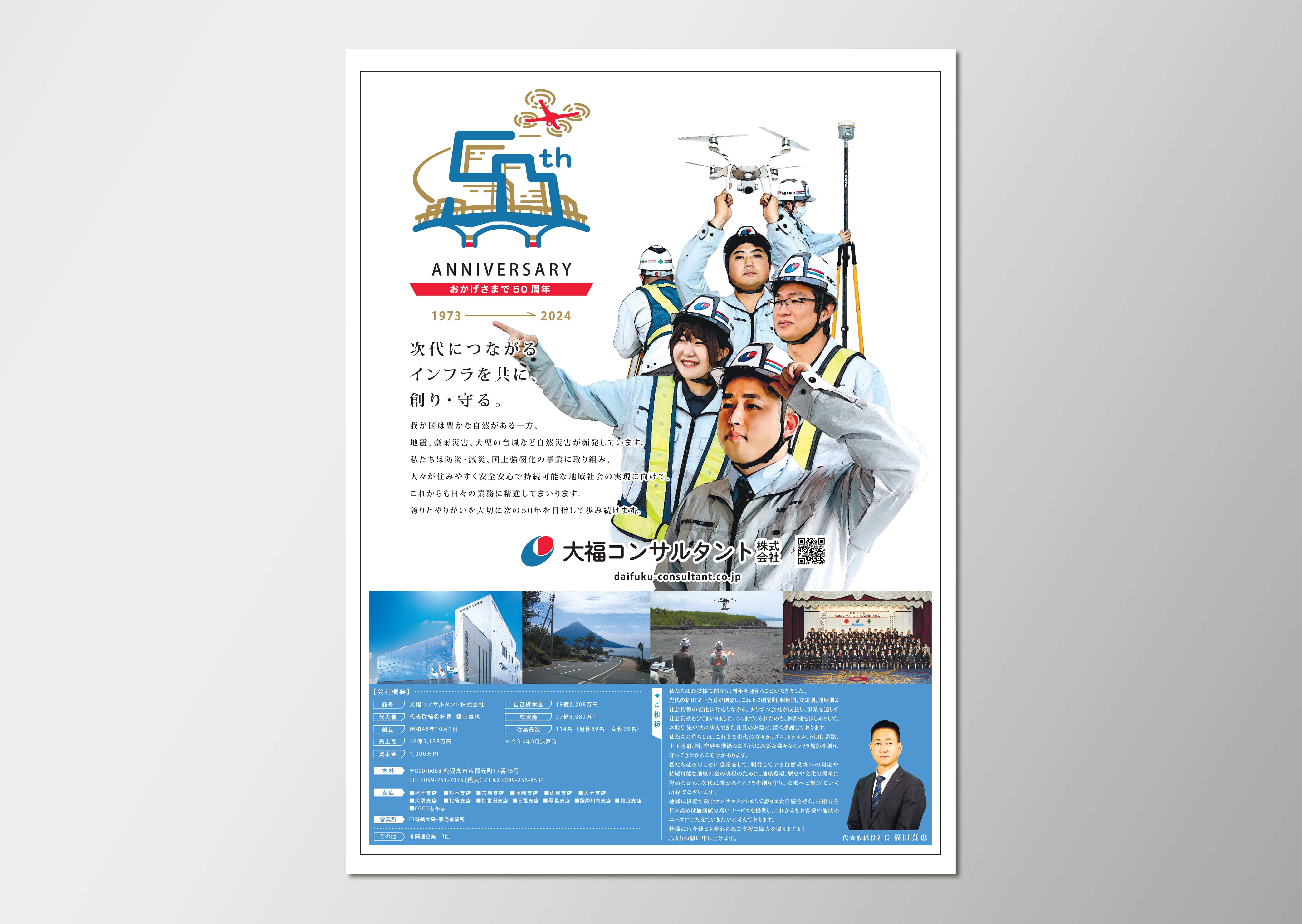 大福コンサルタント株式会社 50周年 企業広告 新聞広告・パンフレットロゴデザイン、広告デザイン、広告 写真は「HINOSASU ヒノサス 」鹿児島県鹿児島市易居町。