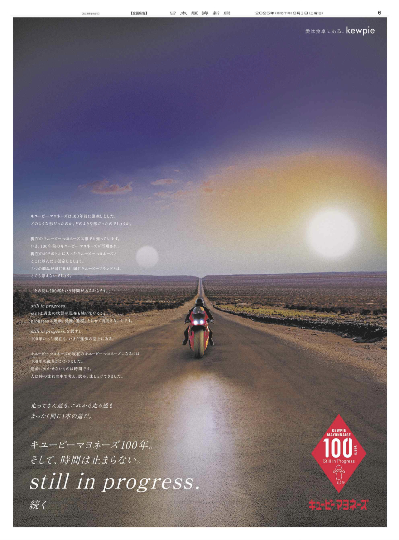 NIKKEI BRAND VOICE 日本経済新聞の広告紹介アカウント on X: "3 1掲載キユーピー の広告です。 今年で100周年を迎える「キユーピーマヨネーズ」。 手を止めることなく進化し続けるという決意を込めた「still in progress」という言葉を、長く続く一本道を走るバイク。