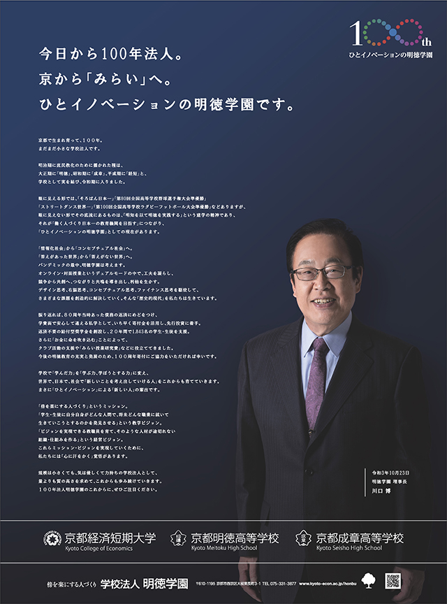 明徳学園創立100周年の新聞広告を掲載しました学校法人明徳学園。