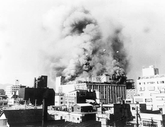 煙を上げて燃える熊本市中心街の大洋デパート=1973年11月29日 - 「大洋デパート」の火災、教訓に 熊本で五十回忌 遺族「記憶風化させない」 -写真・画像 1 2西日本新聞me。