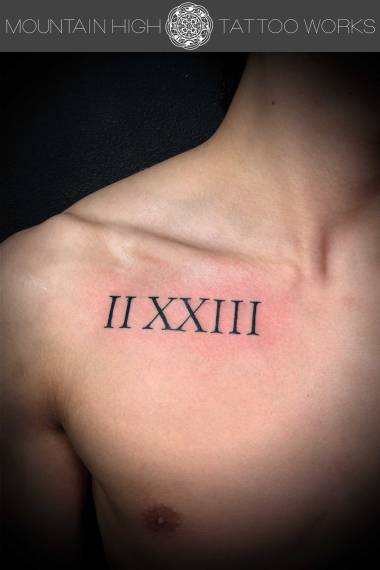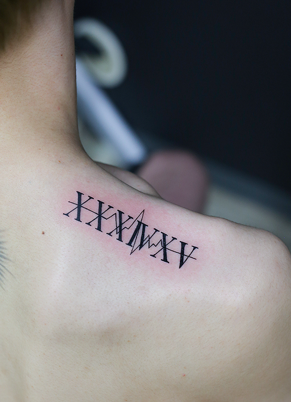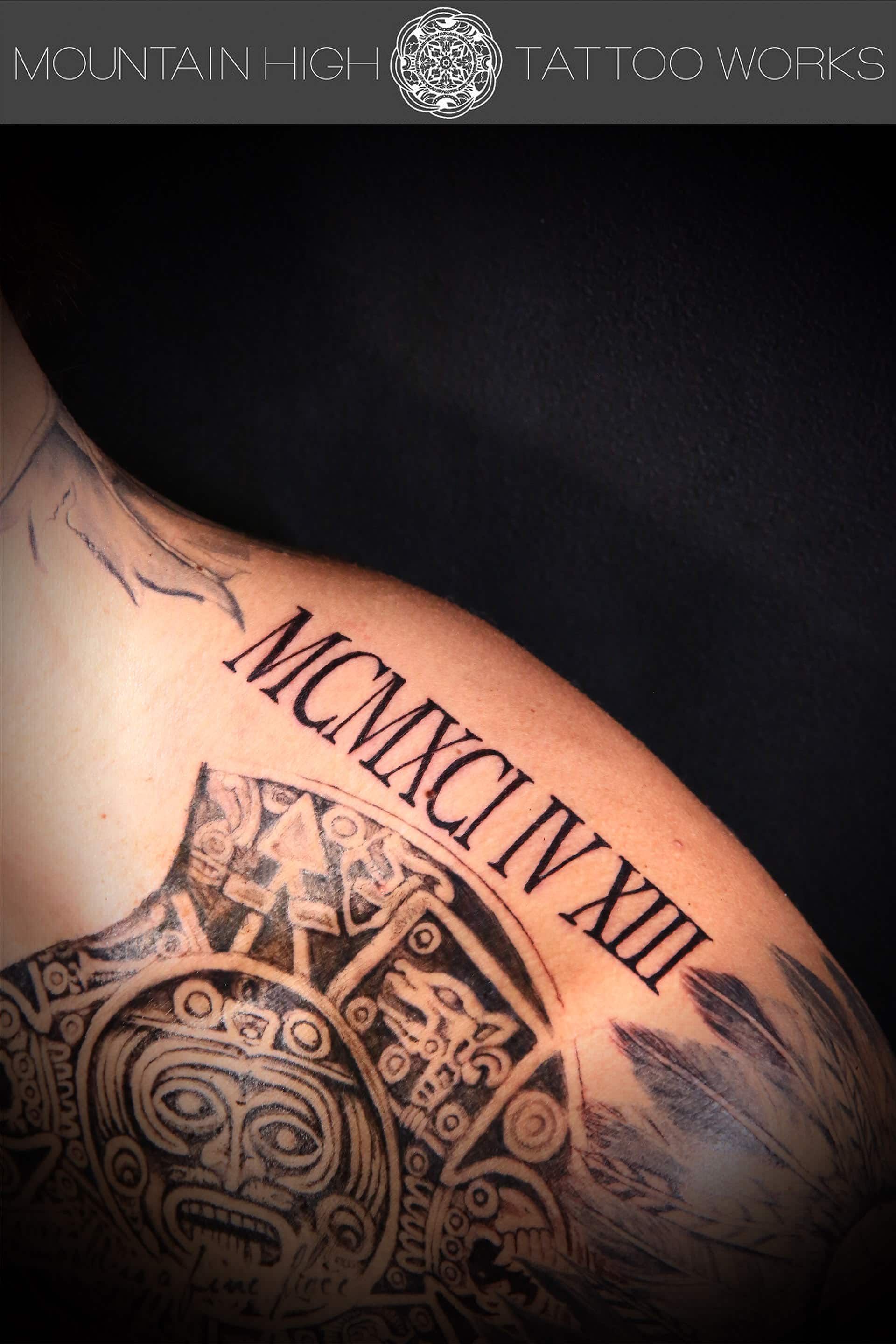 肩にローマ数字のタトゥー札幌のタトゥースタジオ MOUNTAIN HIGH TATTOO WORKS作品集。