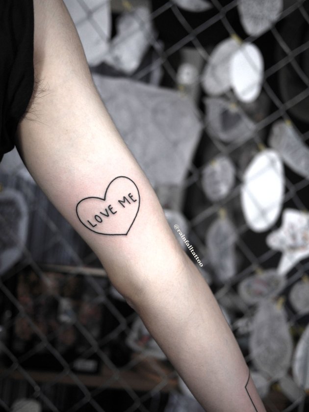 文字のタトゥースクリプト、アラビック、ローマ数字、ハート。東京のタトゥースタジオ レインフォールタトゥ。