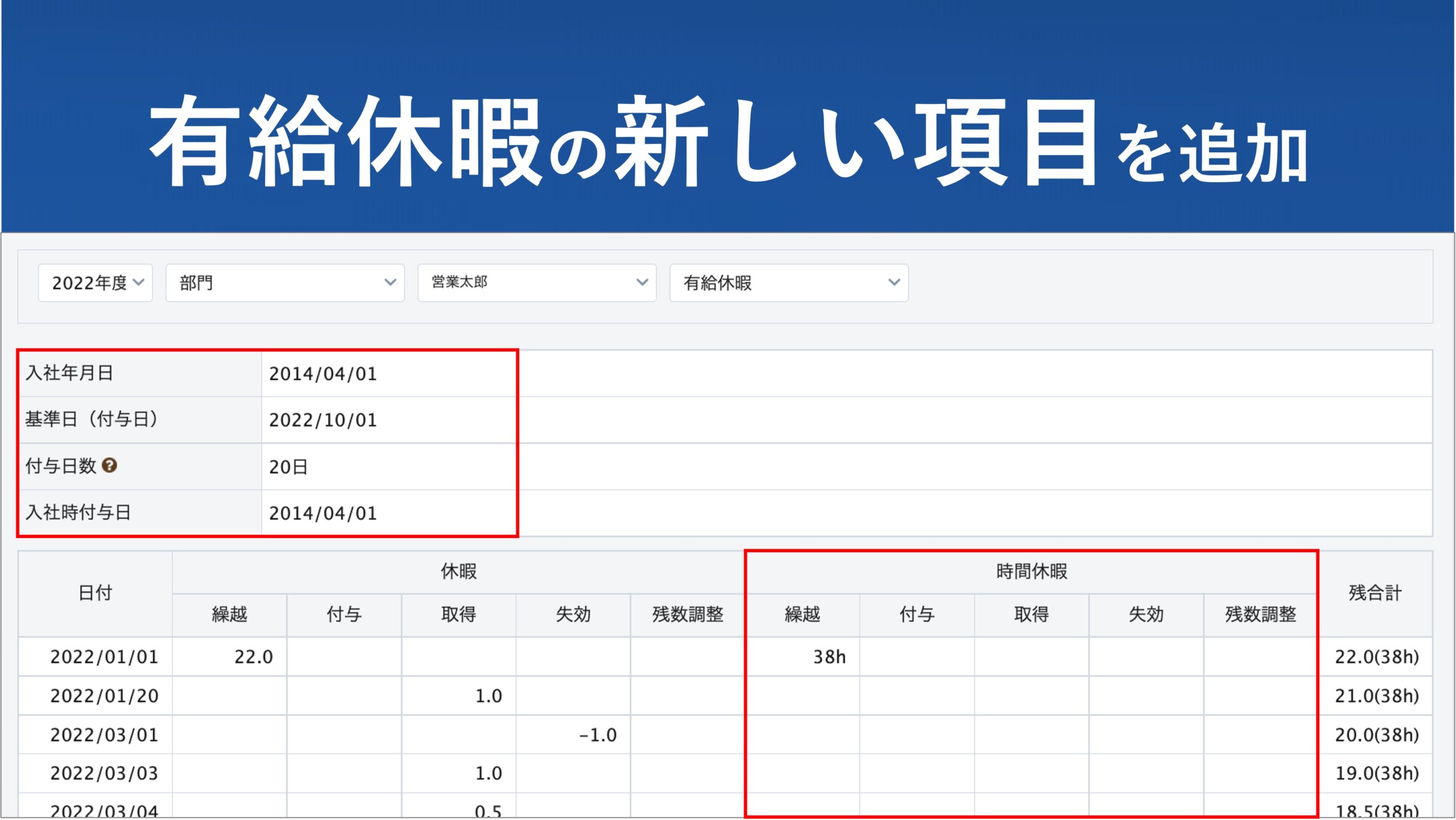 休暇管理画面の変更 有給休暇に関する項目を追加しました 時間有給の管理・有給休暇の付与日と基準日│ HRMOS勤怠 by IEYASU勤怠打刻ファースト。