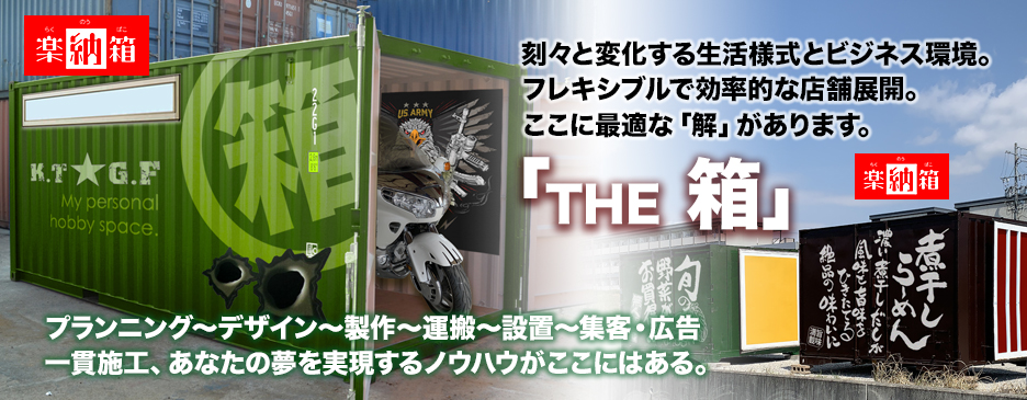 デザインコンテナ販売 コンテナショップの外装デザインから内装の施工、運搬・設置・撤去までトータルに自社で責任対応!価格・デザイン・コンテナ リニューアル等ご相談はお気軽に! コンテナ事業:THE 箱。