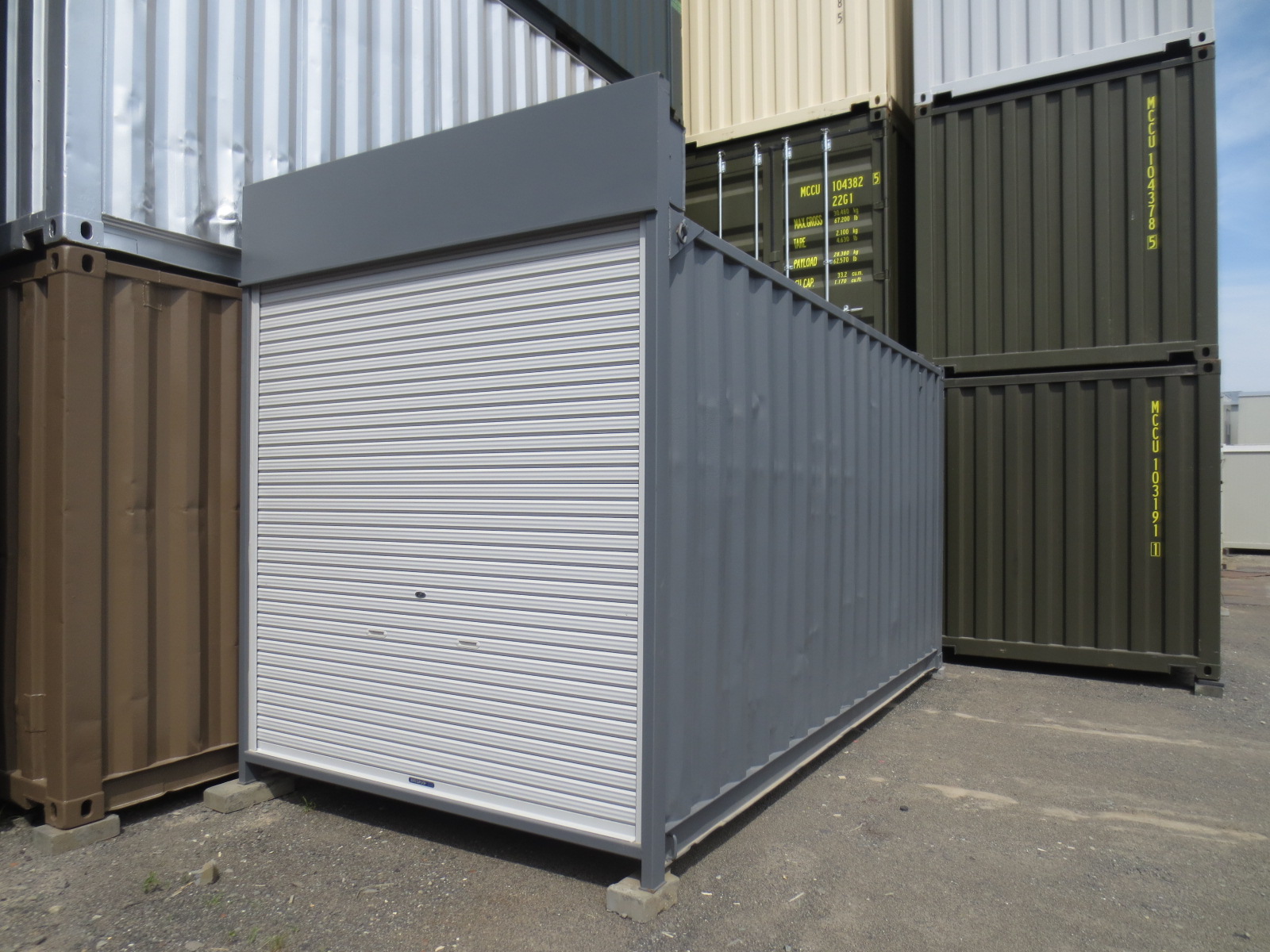 多機能仕様 20ft 中古コンテナ 観音扉+ガラス窓付き・グレー色 販売情報。