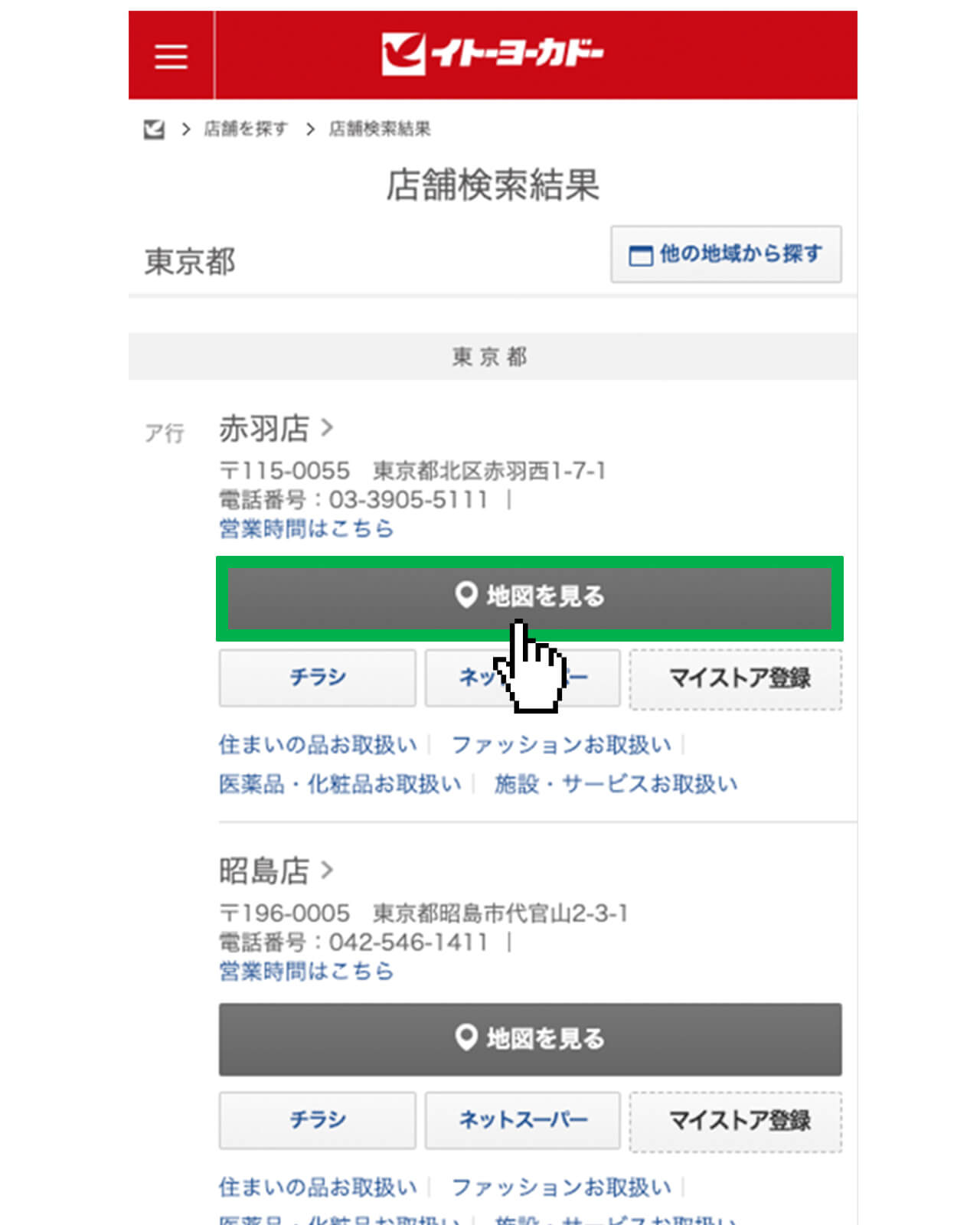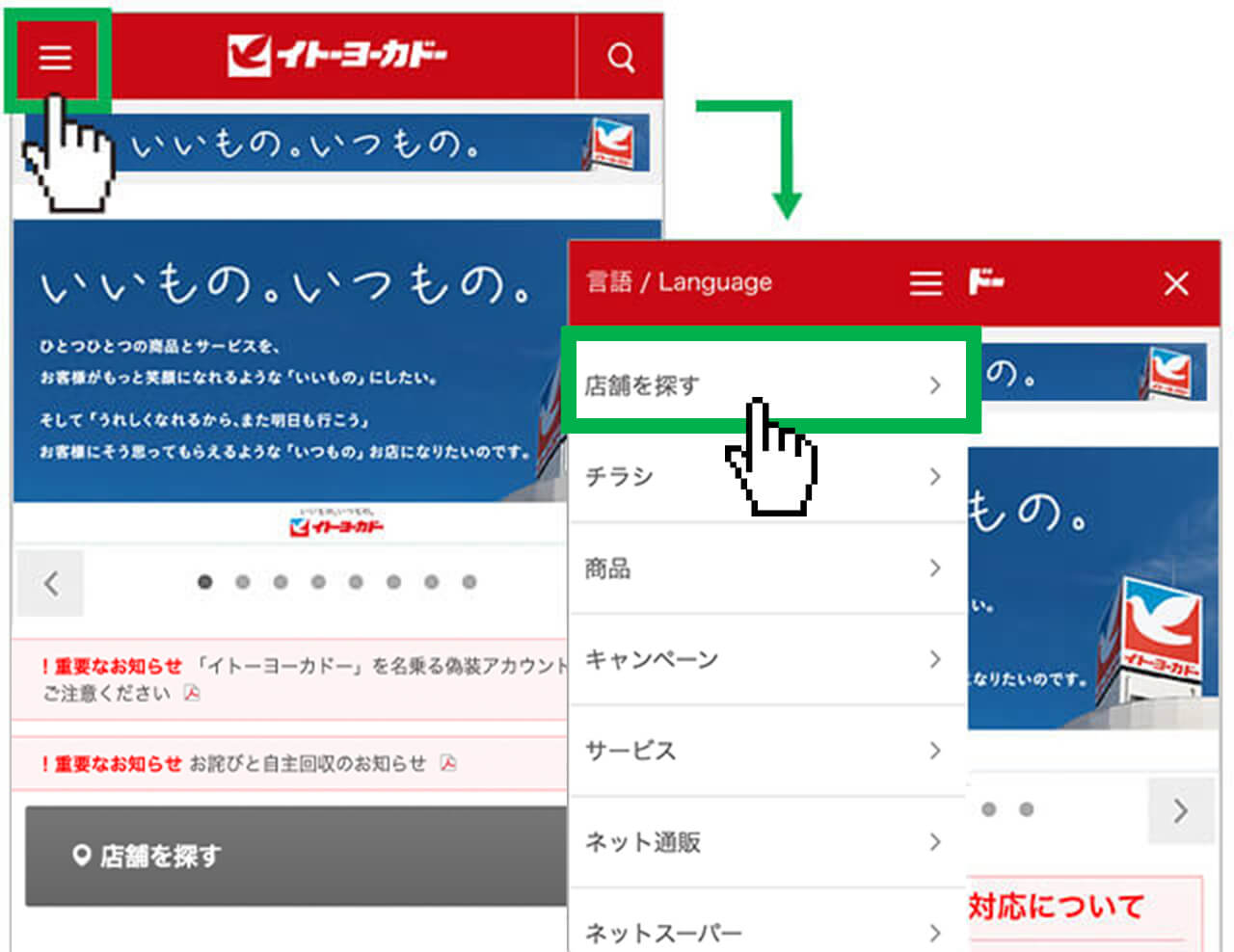 イトーヨーカドー各店の混雑状況 目安 の確認手順。