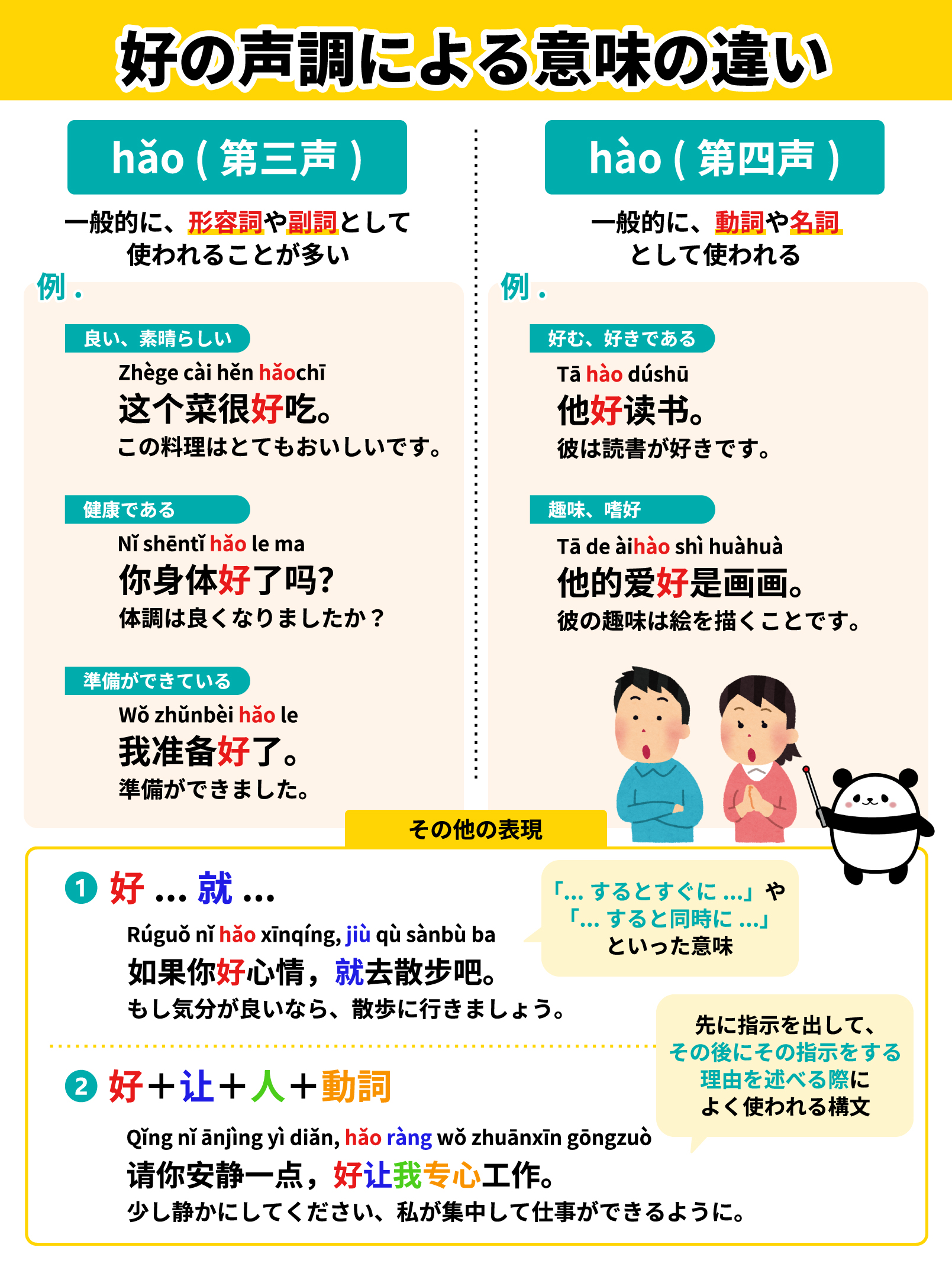 かね毎日中国語 sa X: "\比べてみた!「好 hǎo 」と「好 hào 」の違い主に「好」は良いや好ましいの 意味で知られていますが、「好」の声調によって 意味と使い方に違いがあるの知ってましたか? 結論から言うと: 「好 hǎo 」 → 良い・満足のいく 「好。