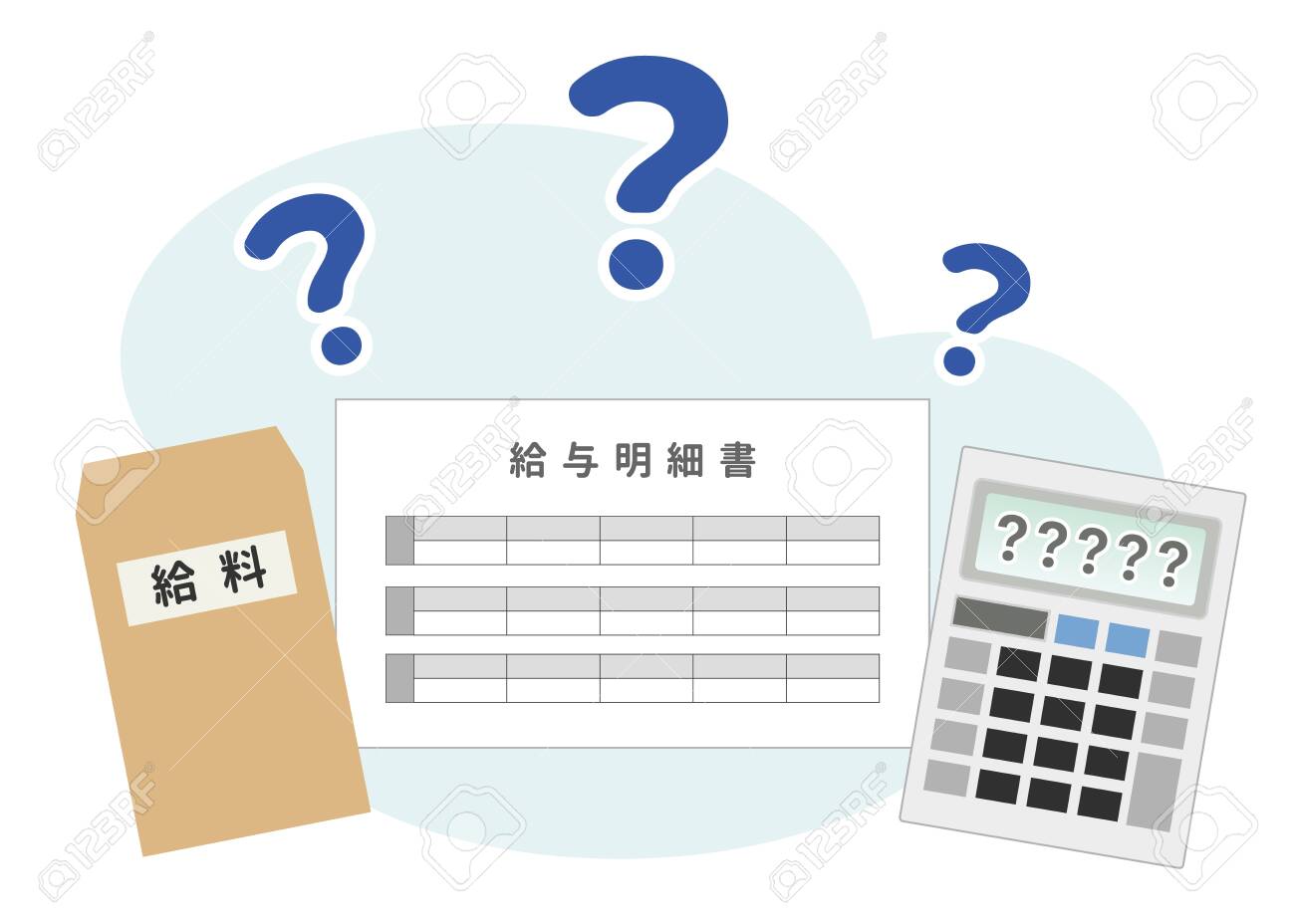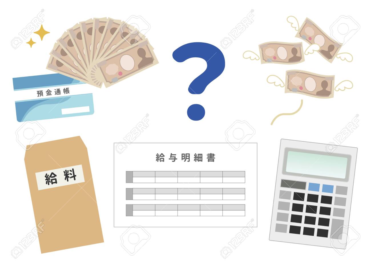 給料、収入、お金について考えます。画像イラスト。日本語で「給料」と「給与明細」と書いてあります。のイラスト素材・ベクター Image 151758386。