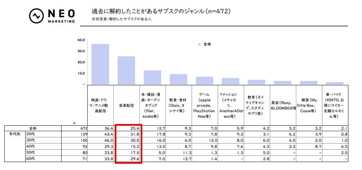 サブスク利用経験TOP2は映像系と音楽、20代が最多定額制サービスに関する調査株式会社ネオマーケティングのプレスリリース。