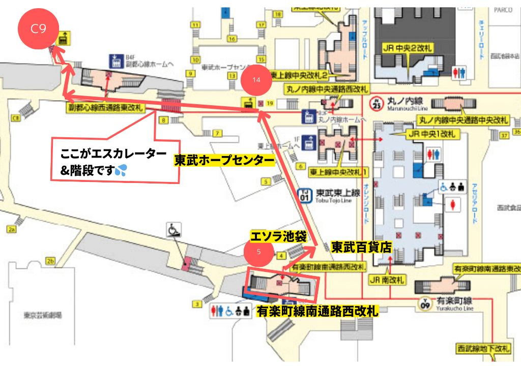 池袋駅 有楽町線と東武東上線線間の乗換え道順・エレベータールートつれてんてん。