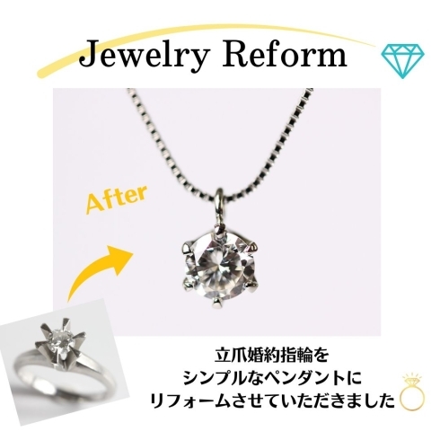 リフォーム ダイヤのネックレスを無くし手元の婚約指輪で新しいネックレス背景・ご要望「婚約指輪をペンダントにリフォームしたい」とご来店くださいました。先日ダイヤのネックレスを無くされ、新しいネックレスが欲しいと思われました。 手持ちの婚約指輪は。