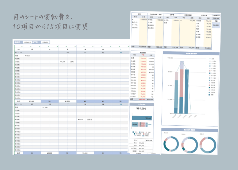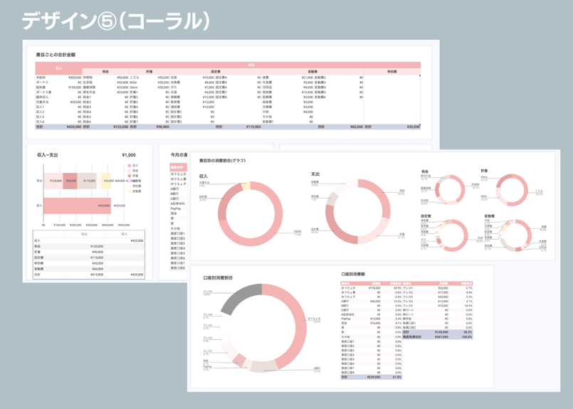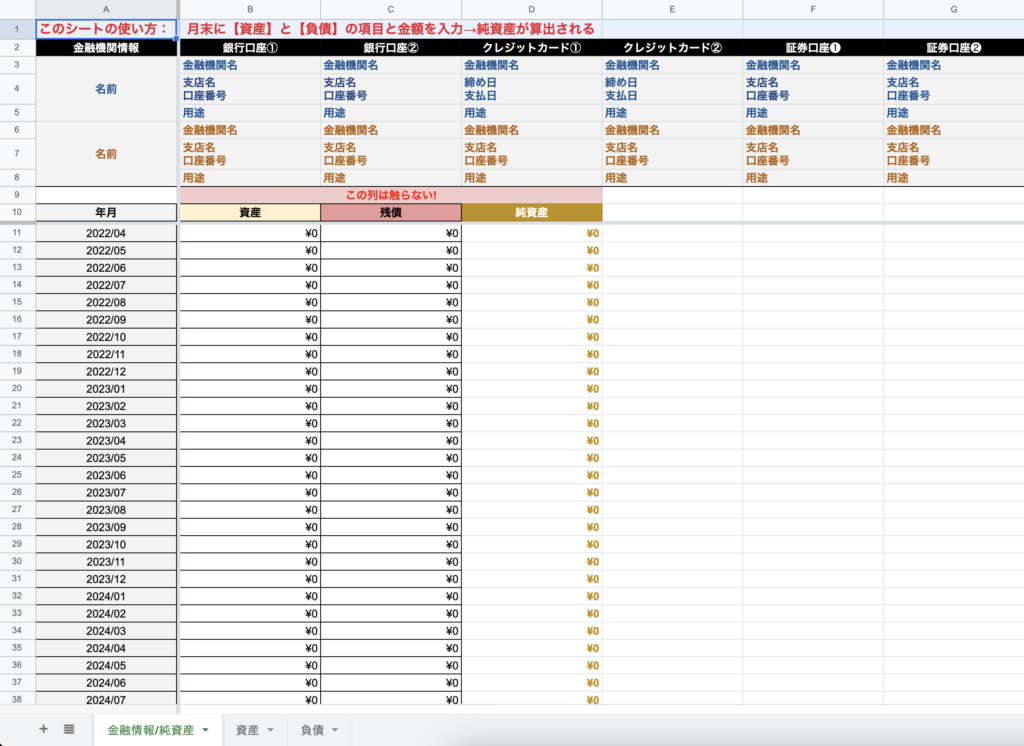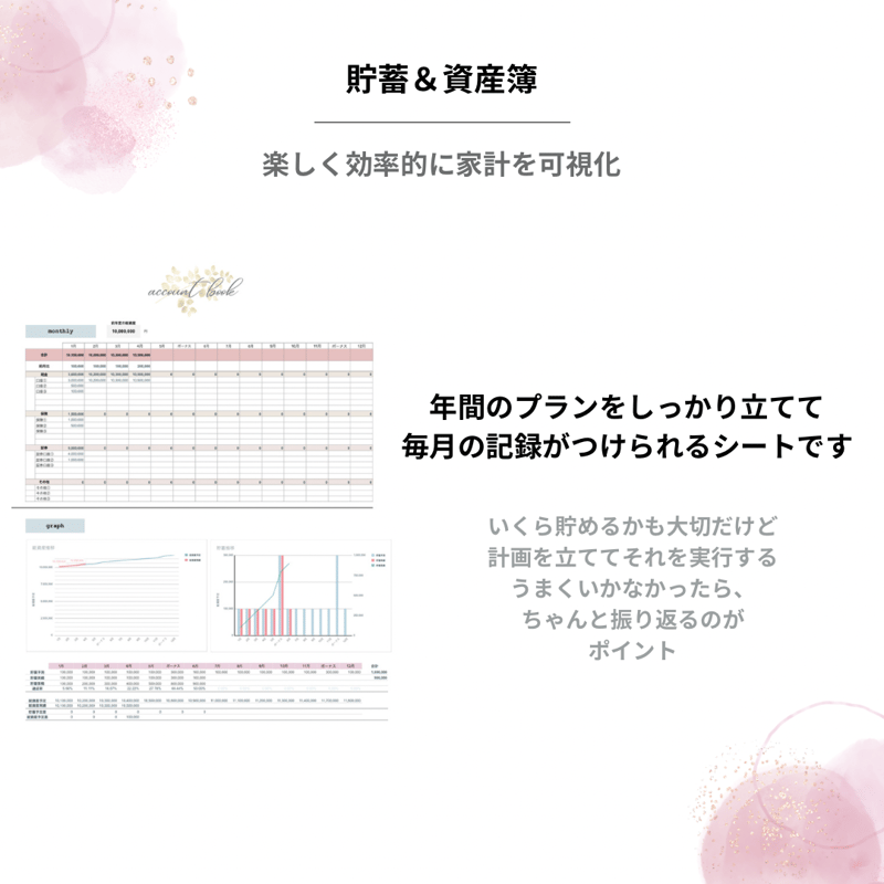 資産&貯蓄簿 家計の見える化 スプレッドシート家計簿デザイン。