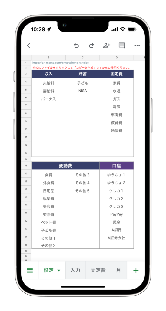 スプレッドシートアプリを使用するスマホ家計簿 無料テンプレート- ari-mamaの家計簿。