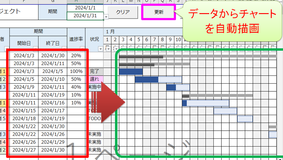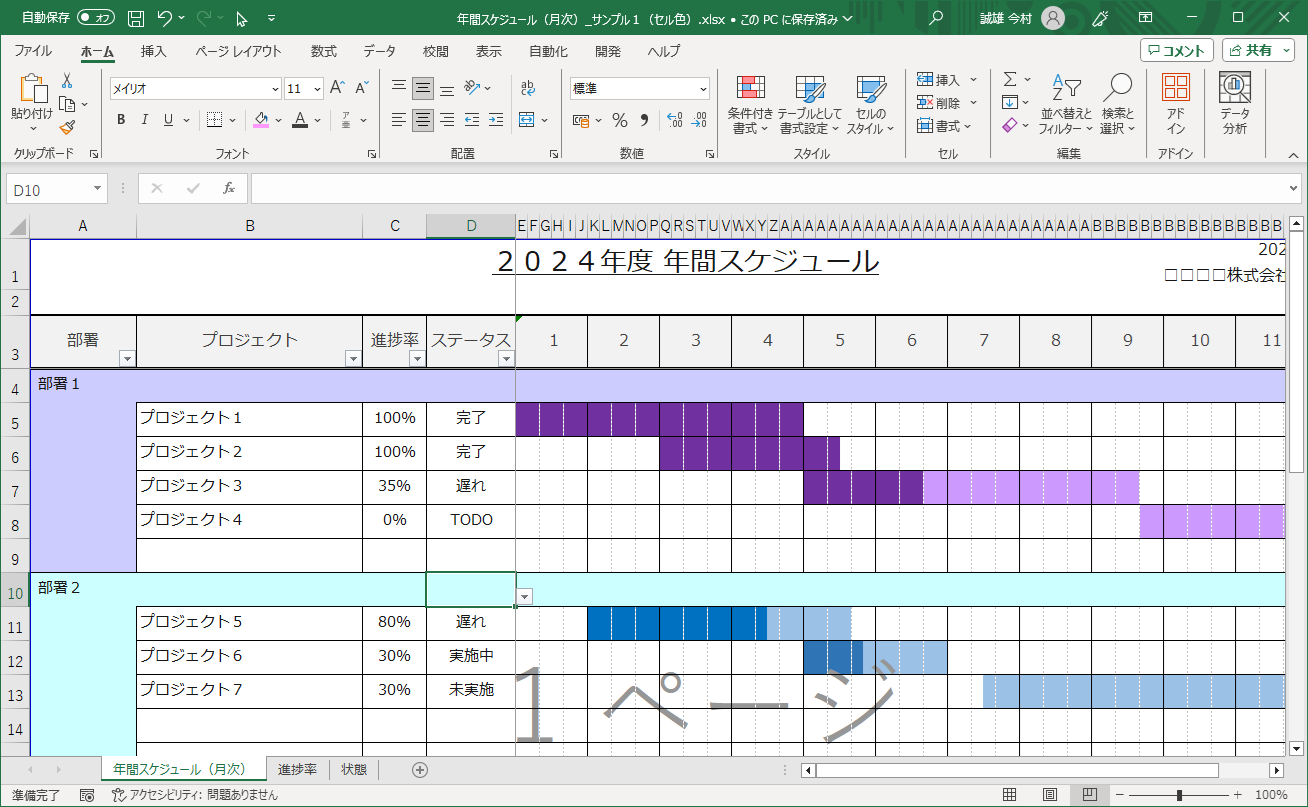 無料Excelマクロ ガントチャート自動描画ツール・2024年版・カラフル・サンプル付きプラスブログ。