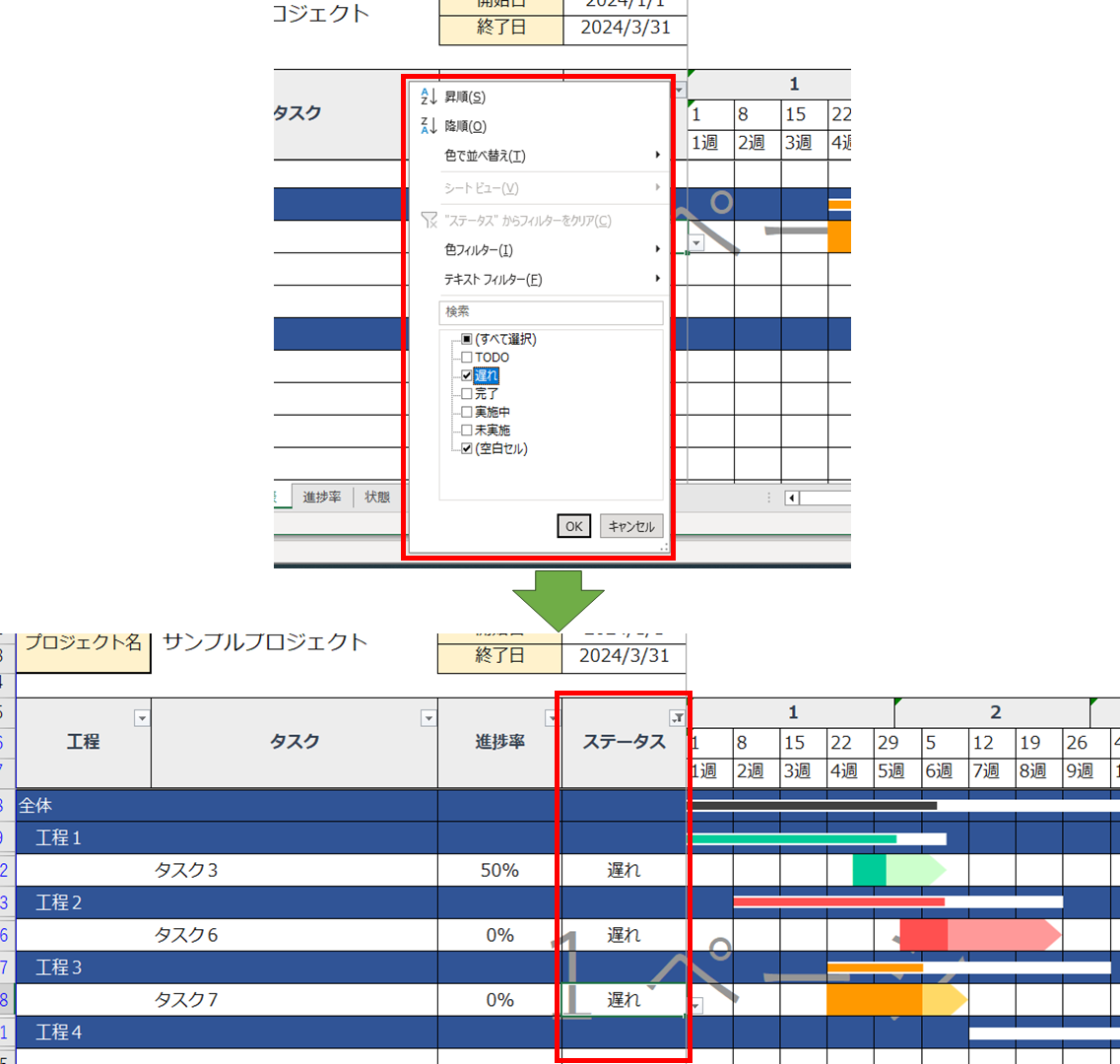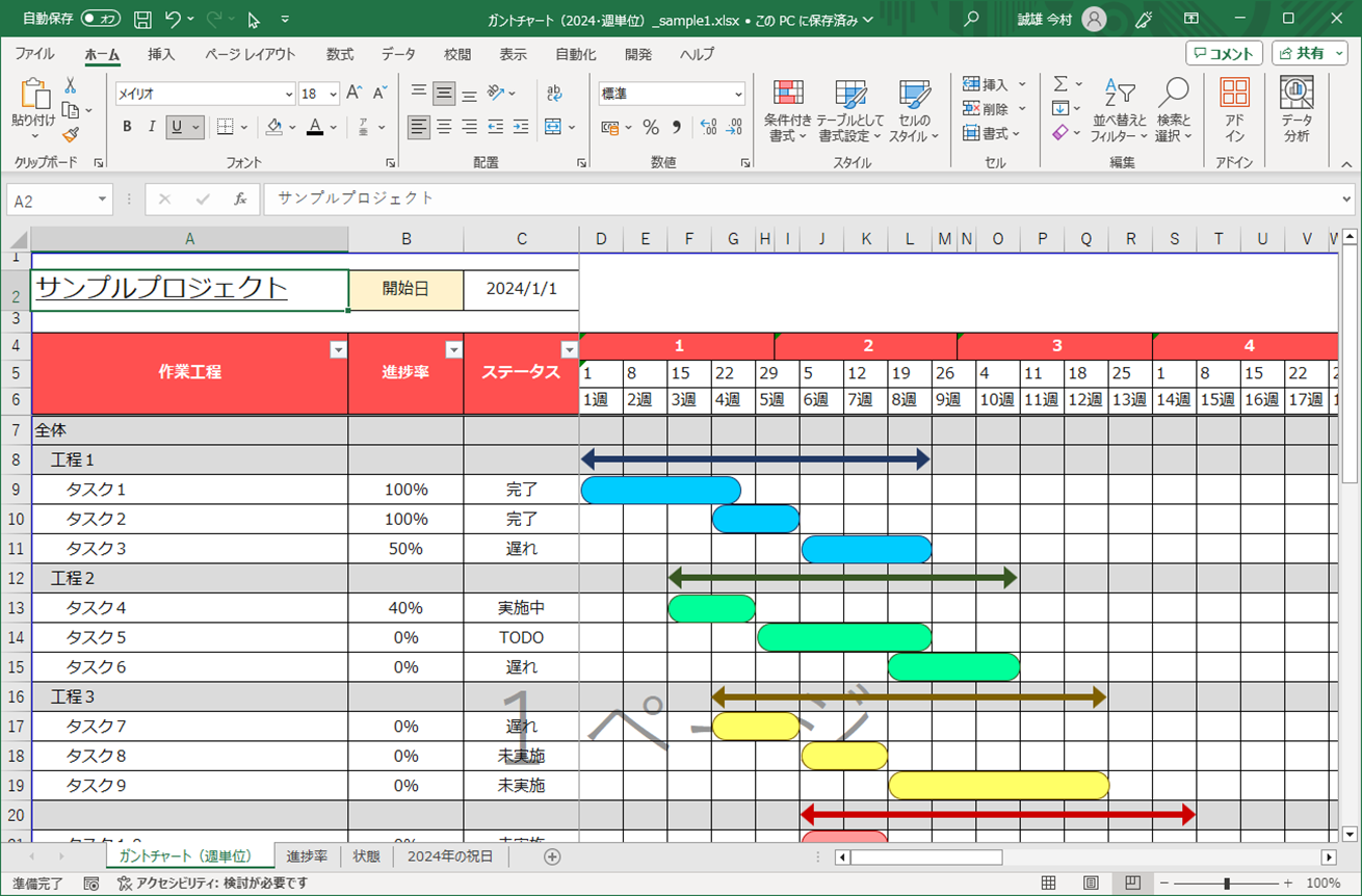 2025年版 ガントチャート 週毎 ・無料Excelテンプレート入力補助・フィルター付き・サンプル付き - すぐに使える便利なExcel テンプレートサイト。