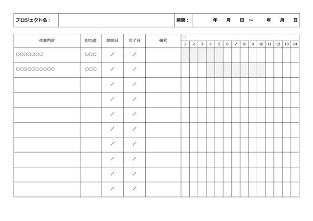 ガントチャートテンプレート01「シンプルな2週間用」 ワード・Word 無料ダウンロードテンプレートNAVI。