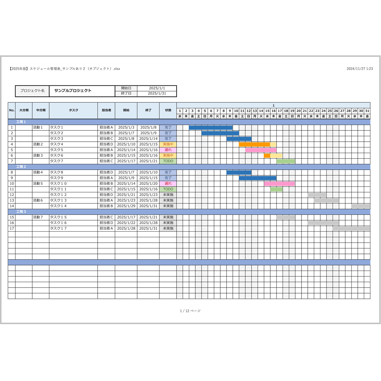 2025年版ガントチャート・自動描画ツール無料・Excelマクロ・入力補助・フィルター付き・サンプル付き - BIZ-NEXTテンプレート。