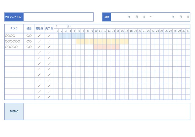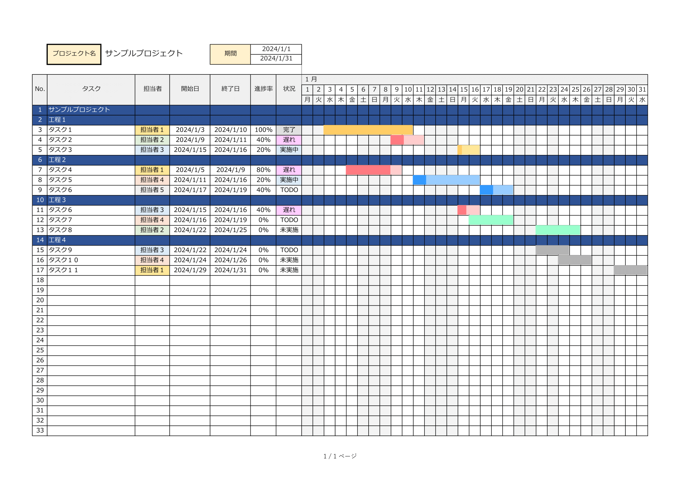 ガントチャート テンプレート 無料DL Excel工程・進捗可視化日・週・月・年間・時間刻み対応Bizroute。