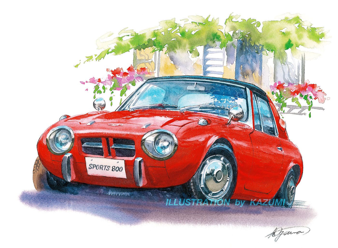 イラスト トヨタ スポーツ800 A4サイズ額入り小さな美術館。