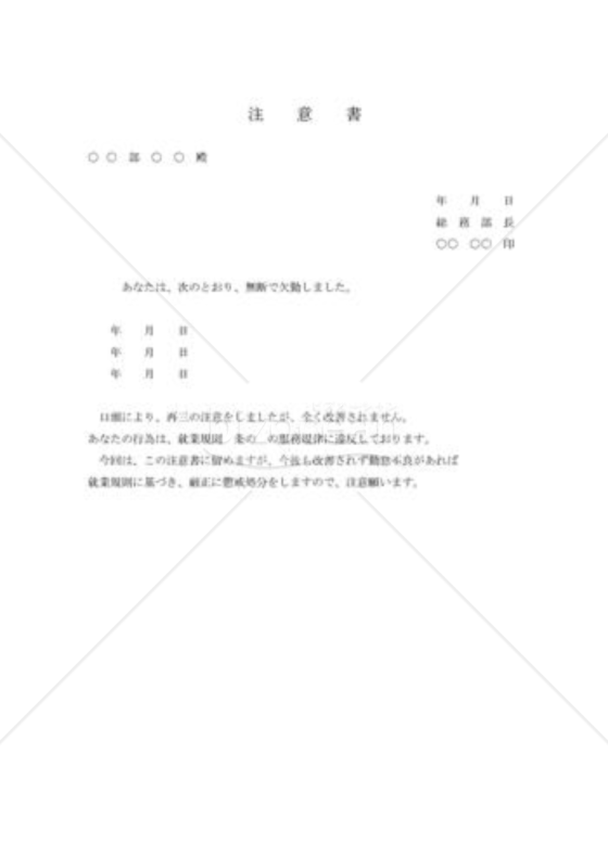 文書 テンプレートの無料ダウンロード: 注意文 注意文書 ・警告文 警告書・警告文書 ・禁止文。