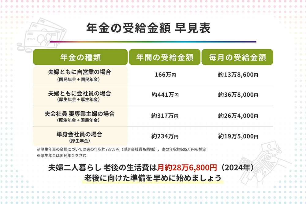 老後の年金はいくらもらえる?年齢別・職業別の受給額や増やし方を徹底解説 │マニュライフ生命。