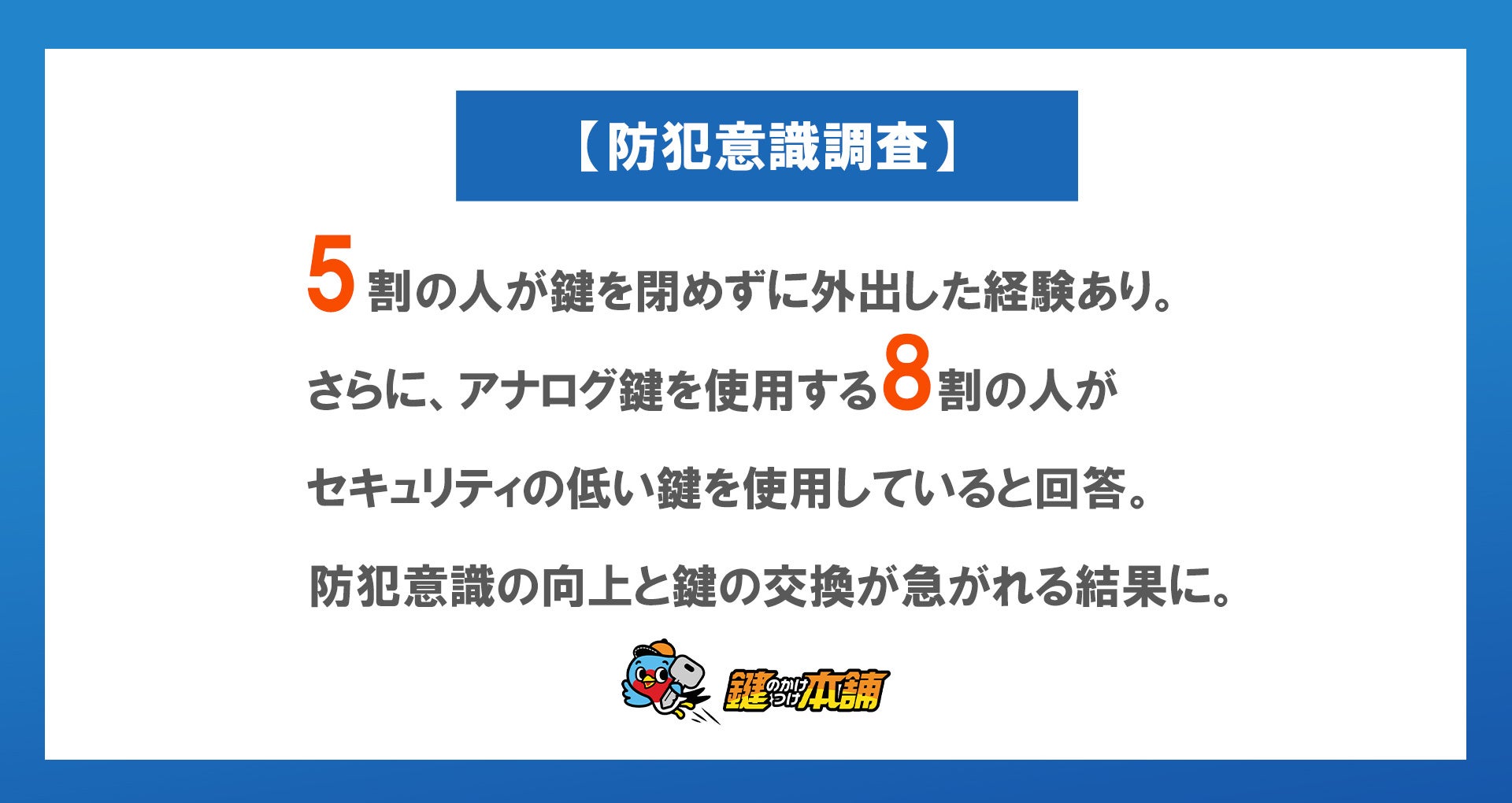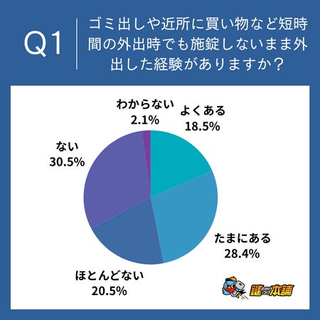防犯意識調査 5割の人が鍵を閉めずに外出した経験あり。さらに、アナログ鍵を使用する8割の人がセキュリティの低い鍵を使用していると回答。防犯意識の向上と鍵の交換が急がれる結果に。株式会社ライフ&テクノロジーズのプレスリリース。
