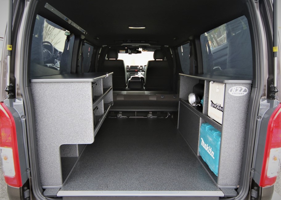 大工職人の車🚙自作の収納棚に整理整頓された工具 日産NV200バネットバン。